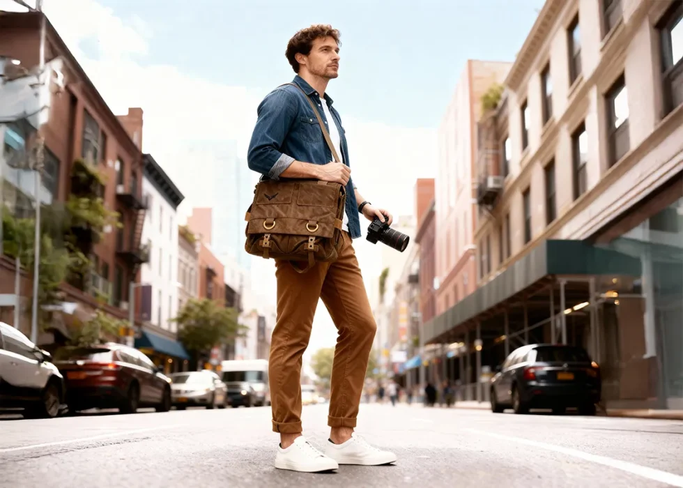 Mann-mit-Gleann-Bag-L-auf Straße_7zu5
